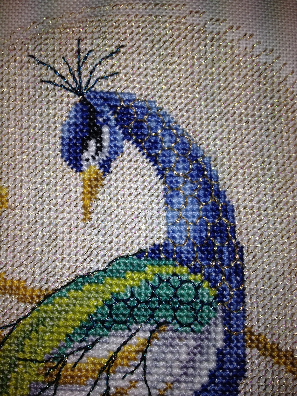 Well I am back to stitching on the Swirling Peacock from Joan Elliott...